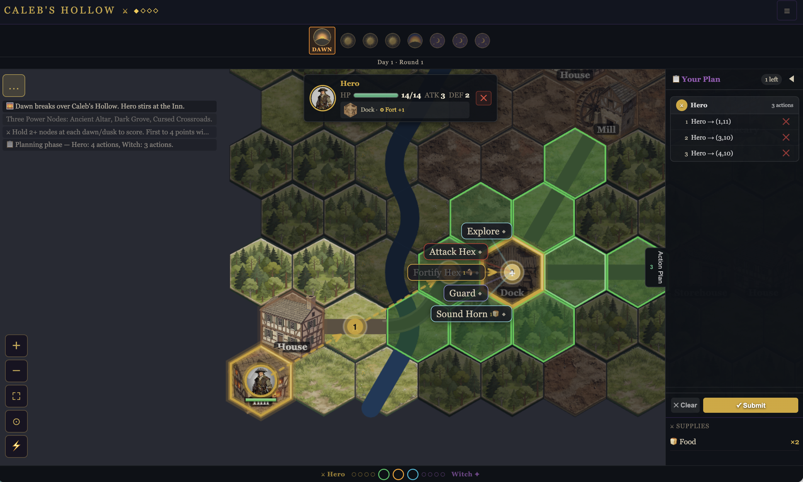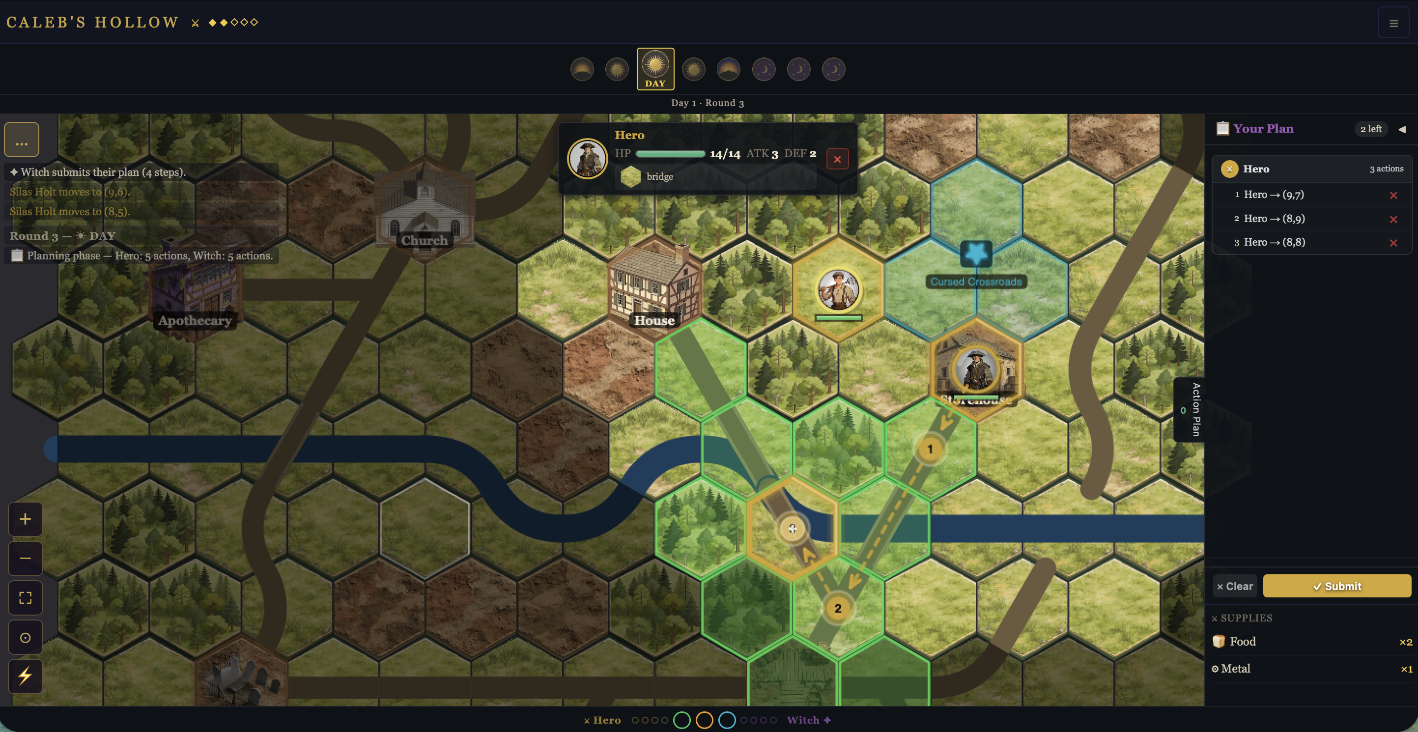 Caleb's Hollow is an asymmetric, simultaneous-turn strategy game on a procedurally generated hex grid. Command the Hero — exploring cursed buildings, finding survivors, and fortifying against the night — or unleash the Witch, summoning undead minions and seizing strategic points in the town to complete a dark ritual.